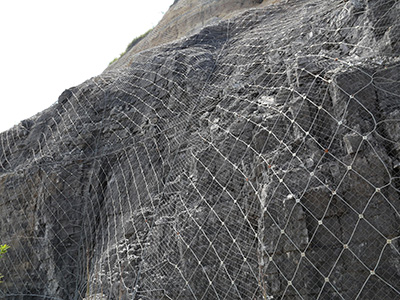 主动防护网是以钢丝绳网为主的各类柔性网覆盖包裹在所需防护斜坡或岩石上,限制坡面岩石土体的风化剥落或破坏以及危岩崩塌,将落石控制于一定运动范围内以保护行人和车辆安全通过的防护工具。