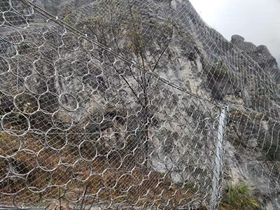 环形网是有单根钢丝盘结而成两端头间搭接长度不小于100mm。盘结而成的环用钢质或铝合金紧固件至少在均匀分布的三处箍紧,且其中一处位于两端头的搭接处,除边缘环孔外,每个环与其周边的4个环相扣联。单机具即可进行系统的安装、维修和部件更换。